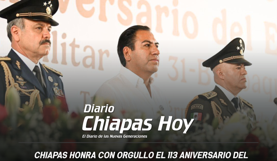 – Un reconocimiento pleno a las y los integrantes de las fuerzas armadas del país, por defender la soberanía nacional, seguridad y paz de las y los chiapanecos, coincidieron en señalar la diputada Alejandra Gómez Mendoza y el diputado Mario Guillén Guillén, presidentes de la Mesa Directiva y de la Junta de Coordinación Política en el Congreso del Estado, respectivamente, al acompañar al gobernador Eduardo Ramírez Aguilar en la conmemoración del CXIII Aniversario del Ejército Mexicano. Acompañados también por el Gral. Div. E.M. Alejandro Vargas González, comandante de la VII Región Militar, en el acto cívico, los presidentes de los órganos de gobierno del Poder Legislativo declararon: “Este día se rinde homenaje a mujeres y hombres que, con disciplina, lealtad y valentía, dedican su vida a la defensa de nuestra soberanía y al fortalecimiento de la paz en nuestro país”.