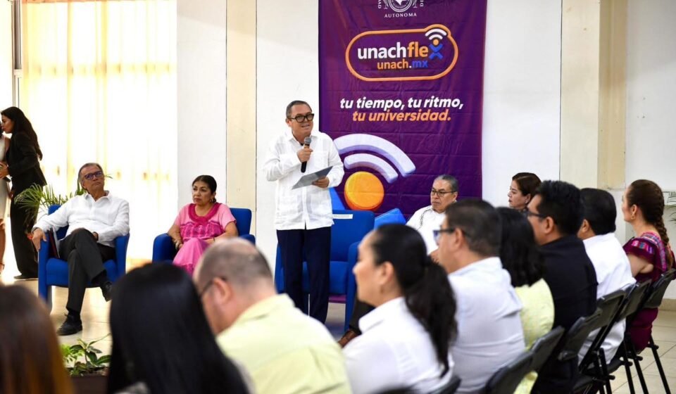 La Universidad Autónoma de Chiapas presentó la estrategia educativa UNACH Flex, bajo el lema “Tu tiempo, tu ritmo, tu universidad”, con el objetivo de fortalecer y consolidar la educación no presencial y mixta en sus modalidades en línea, abierta y a distancia.