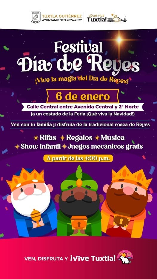 4 de enero del 2025. El Ayuntamiento de Tuxtla Gutiérrez invita a las familias al Festival Día de Reyes, una celebración llena de magia, alegría y tradición que se realizará este 6 de enero en la Calle Central, entre Avenida Central y 2ª Norte, a partir de las 4 de la tarde, a un costado de la Feria ¡Qué viva la Navidad!