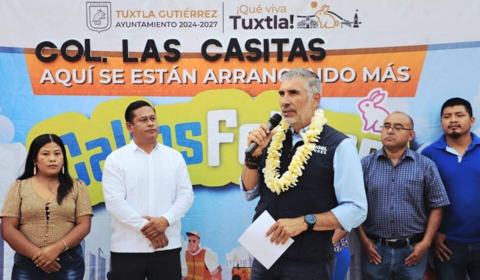 El presidente municipal de Tuxtla Gutiérrez, Ángel Torres, dio el banderazo de inicio a los trabajos de pavimentación de la calle 7 en la colonia Las Casitas, acompañado de vecinas y vecinos que celebraron el arranque de esta obra largamente esperada.
